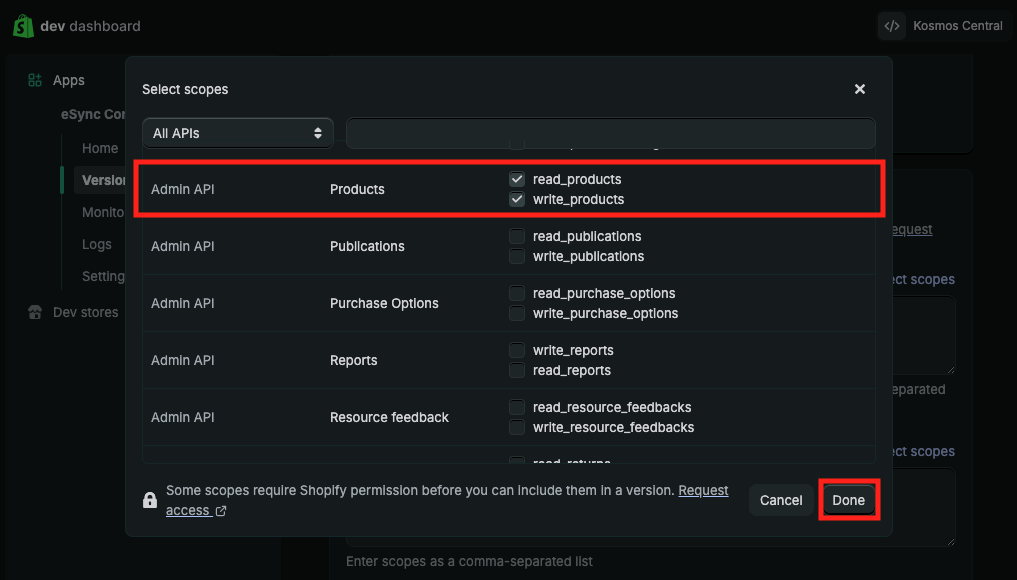 After selecting the product scopes, click the Done button in the bottom right corner.