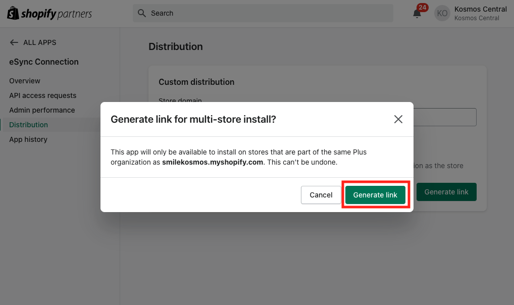 Next: enter the url of your Shopify account, click Generate link, and select the Generate link button.