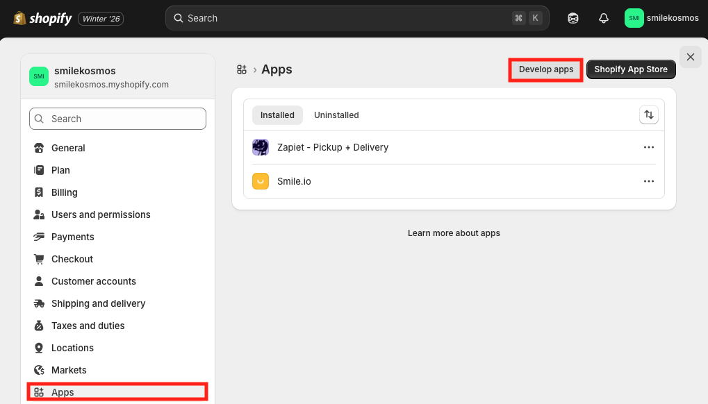 Select Apps from the left menu, then click the Develop apps button in the top right corner.