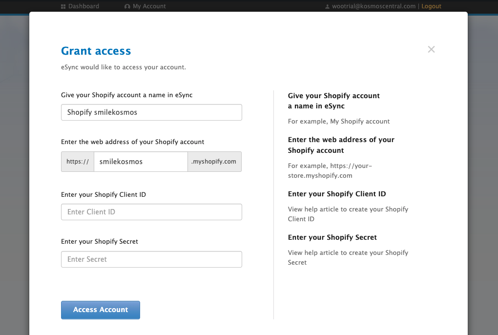 Below you’ll find instructions on connecting your Shopify store with eSync from our eSync dashboard.