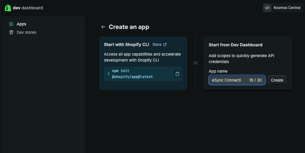 Under Start from Dev Dashboard give your app a name (such as, eSync Connection) and click the create button.