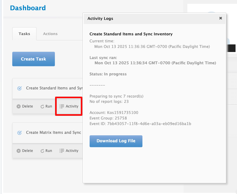 Click the task Activity button to view your activity summary and logs. Please use the activity logs to upload to a Support Ticket for further assistance.
