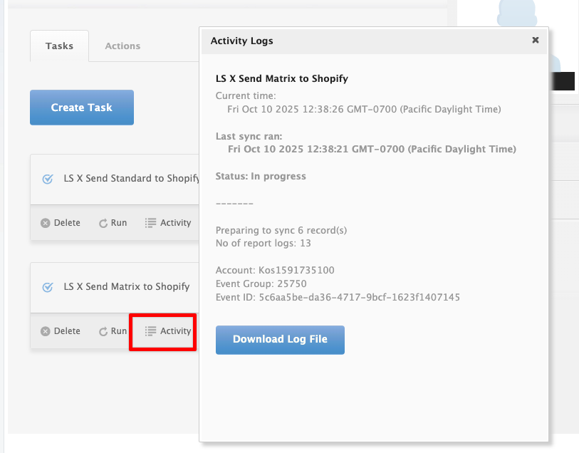Click the task Activity button to view your activity summary and logs. Please use the activity logs to upload to a Support Ticket for further assistance.