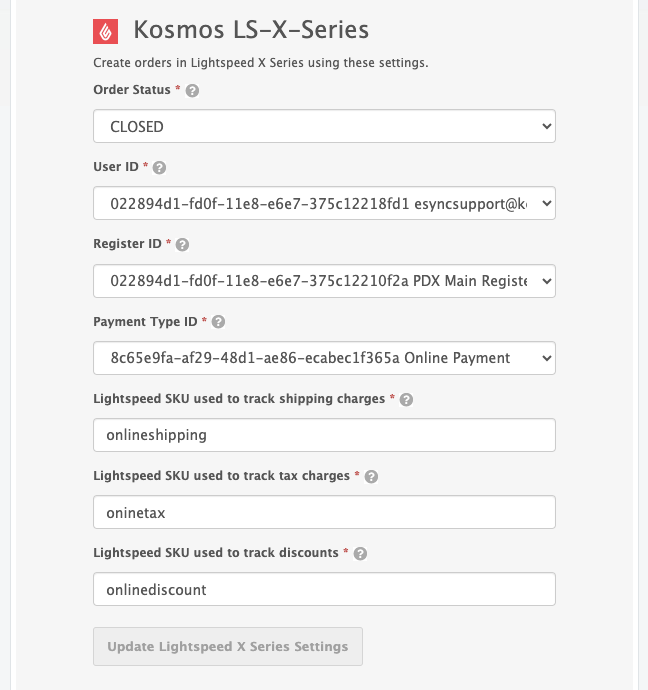 - Next, configure how your order will reach your Lightspeed POS. You will need to assign a location register, payment type, and create a product SKU for shipping, online tax, and discounts. We also suggest setting up a virtual employee (Online Orders) to assist with locating online orders and improving reporting.