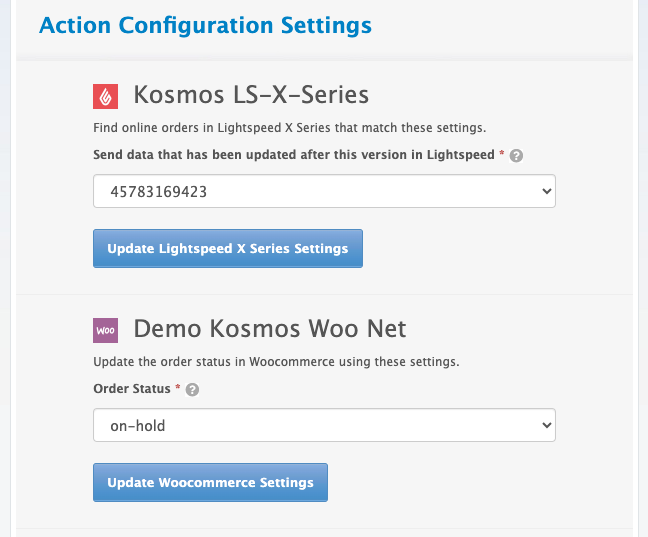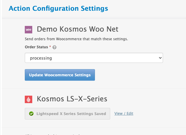 - To download an order into your LightSpeed X POS, Kosmos eSync will need to obtain the order status from WooCommerce. For example, ‘Processing’ is a successful WooCommerce order status. You can configure your order Action to download an order in any status you choose. Kosmos eSync will also download up to 100 of your WooCommerce orders at a time.’